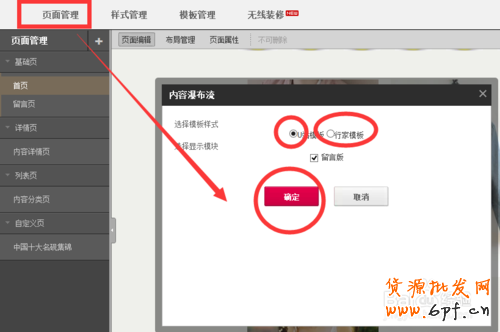 設置好背景之后,再回到頁面管理中,然后雙擊瀑布流頁面,彈出選擇窗口。在這里你可以選擇行家模板或者是u站模板,選擇好后,你可以通過右上角的預覽來了解你選擇模板的效果如何。如圖所示: