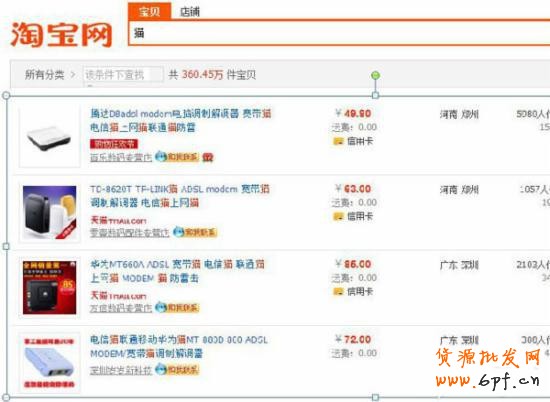比如,用戶在輸入“貓”的時候,搜索引擎會“猜”你想要的是上網用的那種電子設備,而不是我們家里養的寵物貓咪,那么它提取并且推薦給你的也都是上網用的調制解調器,搜出來的店鋪也都是數碼類的店鋪,如圖:
