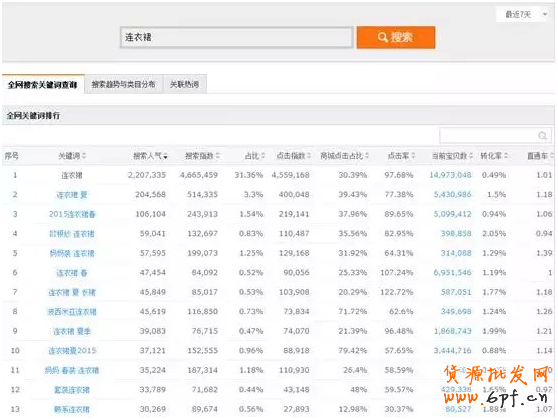 2、輸入 主關鍵詞 “連衣裙”查詢,數據選擇最近7天。