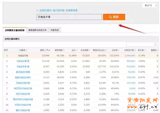 2、輸入 主關鍵詞 “連衣裙”查詢,數據選擇最近7天。