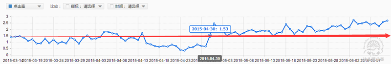 行業急速上升期,一般在直通車的推廣中也會有所反應,這個三七類目的賬戶主要在五月份起,流量與點擊率也明顯有較大幅度的上升,期間通過對行業數據趨勢進行查看,發現影響較大的主要來自于行業的上升,于是契合行業,加大預算進行投放,花費與成交有了大幅度的上升,隨著寶貝流量的沖擊與成交的上升,關鍵詞整體質量分也有所上升,經過優化篩選關鍵詞,點擊率方面不斷提升,與寶貝的流量、成交共同作用,大大提升了直通車各項數據趨勢的上升與店鋪整體的成長。