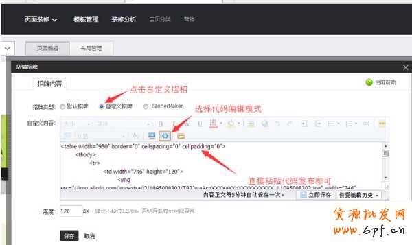 5.把代碼復制好之后進入賣家中心-網店裝修-店招設置-編輯-自定義店招-選擇代碼的編輯模式。接著粘貼你復制的代碼過來就行了。如果你把店招和導航設計在一起的,那就是150px,你在下框內的高度輸入150就可以了,最后點擊“保存”。