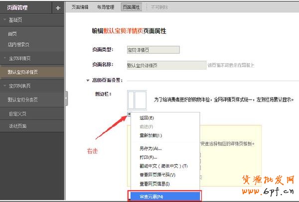 三、來到頁面屬性,側邊詳情頁是強制開啟的,要怎樣做才能隱藏它呢?右擊選擇圓點處,將會看見“審查元素”,按Crtl+F查找“checked=checked”,然后把這段代碼刪除保存即可,接著按照950px布局設計店鋪裝修就行了。