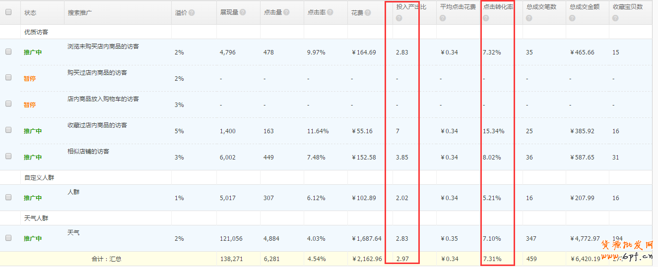 ②轉化率:在關鍵詞受行業趨勢下滑從而不穩定的情況下,可以重點把搜索人群做一下,具體精準到做“瀏覽未購買店內商品的訪客、收藏過店內商品的訪客、相似店鋪的訪客、人群、天氣”。因為大家也知道童裝受“人群定位和天氣”的影響很大,所以可以針對這兩塊,重點精準人群投放,確保高轉化!二、店鋪提高轉化的方法