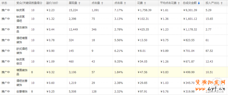由于這種鐵皮畫的小商品類目比較單一,所以關鍵詞的沖突,內部競爭會比較大,為了避免競爭,會對關鍵詞進行分類投放,把一些大詞,搜索量比較大的關鍵詞集中在點擊轉化率較好的重點寶貝上,其他寶貝就盡量加一些與寶貝相關的一些精準詞。