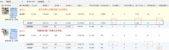 我們看看數據,寶貝1的定向推廣要比關鍵詞的效果好,在定向推廣中整體有成交、加購、收藏等。這就為我們在后期推廣中獲得了推廣的寶貝方向。