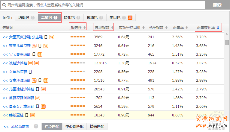 受行業影響,行業推薦詞的展現量也有所下降;賬戶在選詞的時候主要是考慮三大維度:精準性、展現量、點擊轉化率,在精準性較高的前提下,盡量選擇行業展現量、點擊轉化率較高的關鍵詞;具體的話,可以在“轉化包”按展現指數進行排序,再結合相關性進行篩選;也可以在“流量包”按點擊轉化率排序,同樣地結合相關性進行篩選。