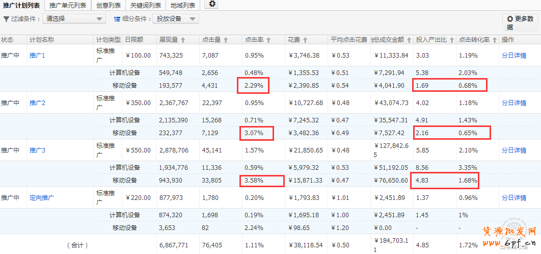 1.主要投放方向  在優質訪客以及自定人群這塊數據都是比較不錯的高點擊率高轉化低PPC。