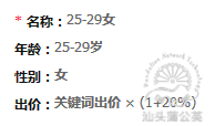 3.自定義人群  針對25-29女、18-24女、30—34女分年齡層進行投放測試效果。其中25-34這部分人群的數據反饋較18-24 這部分人群測試情況好。