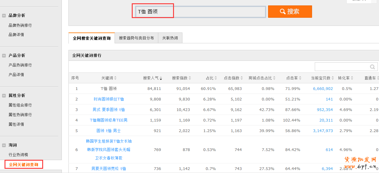 接著整理這些關鍵詞在Excel里進行篩選,保證每個詞都能用得到,并且排除一些搜索量大, 轉化低的刷單關鍵詞。除了行業的Top前500的關鍵詞,還可以通過數據魔方的全網淘詞功能再挖掘更多的關鍵詞。方法是你把本類目的主詞、屬性詞、賣點詞整理出來,然后放到全網淘詞里面取查詢,找到更多你可以用的關鍵詞,如下圖: