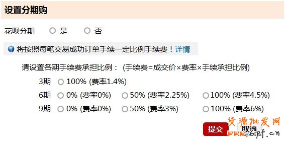 6期、9期,默認買家承擔,賣家可以靈活設置手續費承擔方式,賣家承擔手續費更利于讓買家成交!