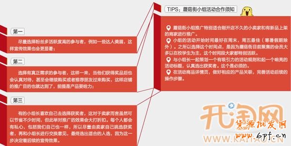 活動規則由贊助商和組長共同協商制定,這也是小組推廣的亮點所在:賣家可以根據自身的情況制定出對店鋪有利的活動方案,比如收藏店鋪、曬任意產品到蘑菇街等,依自身情況而定。