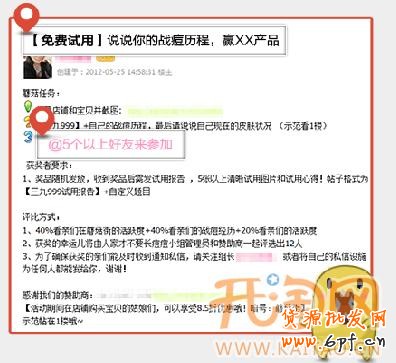 確定合作小組后,賣家與小組負責人聯系進行活動方案的制定。方案的制定當然以為店鋪引流為目的,要求參與者收藏店鋪和寶貝是最直接有效的辦法。但是,為了讓更多的人今與到活動中,一個吸引眼球的活動主題同樣不可或缺,該店鋪與小組負責人溝通后,確定了“說說你的戰疽歷程,東xx產品.的主題,同時要求參與者“@5個以上好友”。