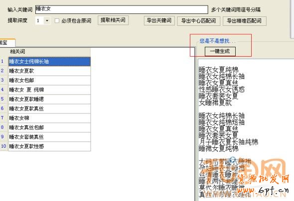 打開該工具,輸入一個中心詞,比如“睡衣”“睡衣女”,點擊提取相關詞,等下面關鍵詞出現完畢后,點擊導出關鍵詞,就可以保存搜到的詞,這部分就是淘寶首頁搜索框下的熱門詞,我們可以在里面挑選適合推廣寶貝的關鍵詞去添加。