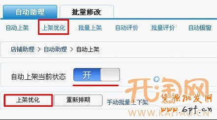 2.在“自動助理”里能很快的就找到“上架優化”,這也是我想要強調的一個功能。里面的“重新排期”即為 批量上架計劃 的制定頁面(下文步驟4我會提及到,剛使用勝券店長的掌柜 可以先進行上架計劃制定,之后,在進行上架優化。)
