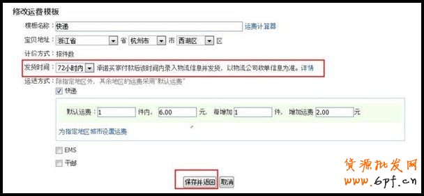 第二步、在“發貨時間”選項合理設置發貨時間后,點擊“保存并返回”發貨時間設置即可啟用。