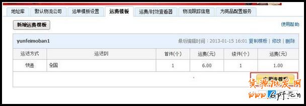 第四步、回到商品編輯頁面---寶貝物流信息--- 選擇運費模板---應用模板,模板設置完成。