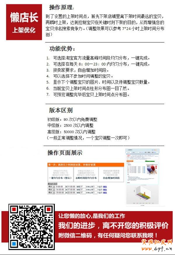 流量高峰時間段一鍵均勻分布;全天15小時一鍵均勻分布;按賣家要求自由安排上架時間段,可選擇不參加調整的寶貝,上架時間點分布圖一目了然,不用批量下架寶貝即可自動修改上架時間點,最高可支持50000個寶貝調整。