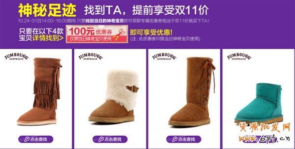 其實,這兩個活動都是商家比較容易想到的,且讓消費者實現的活動方式。比較特別的是“尋找新的寶貝”這個活動。消費者需要通過瀏覽4款不同商品的頁面,找到僅限雙十一當天使用的100元優惠券。當這四個寶貝詳情頁的瀏覽量上去了,網站的整體訪問深度也就有了。說不定在這其間用戶又收藏了幾件商品,除了幾件爆款外,能夠帶動消費的幾件腰部產品也得到的曝光。