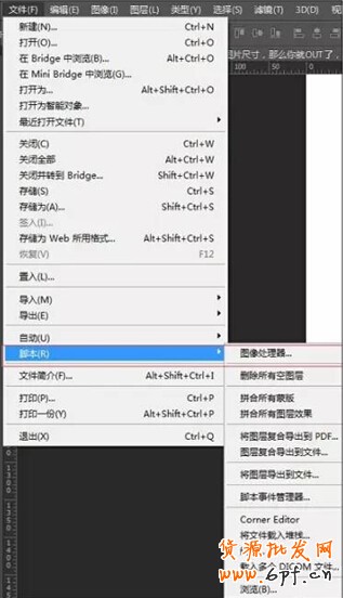 步驟一、開啟PHOTOSHOP,點選菜單欄里的“文件”--“腳本”--“圖像處理器”;