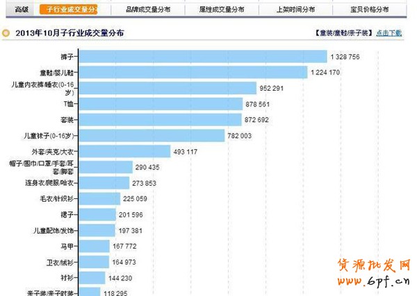 從在童裝/童鞋/親子裝這個類目里的子行業看,把2012年全年的銷量數據及2013年1月到9月份的數據都提取了出來,并且做了一個圖表。下面的圖片是整體銷量的趨勢圖。通過圖表,發現褲子丶童鞋/嬰兒鞋丶T恤丶套裝丶裙子丶兒童襪子(0-16歲)丶兒童內衣褲/睡衣(0-16歲)外套/夾克/大衣丶親子裝/親子時裝,這幾個行業市場空間比較大的同時,增長趨勢也比較的大。因此,我們在選擇童裝行業時可以優先選擇這幾個行業。