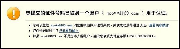 如您在申請支付寶實名認證時,被提示“證件號已被另一賬戶用于認證”: