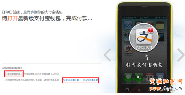 1)如果用戶有裝支付寶錢包,則顯示下面的界面:請打開最新版支付寶錢包版,完成付款(點此查看操作流程);若用戶不想在手機上付款,可以點擊【繼續電腦付款】;