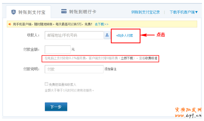 轉賬到支付寶賬戶有兩種形式:向一人付款;向多人付款;