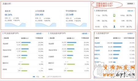 2、店鋪流量構成:分PC端與無線端,免費與付費,新老訪客。想查看更多訪客數據可以查看訪客分析。