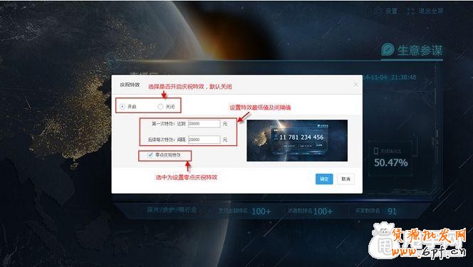 最后設置是否需要零點特效,比如20141111大促24點時刻是否需要流星雨慶祝模式,選中則需要,默認選中。
