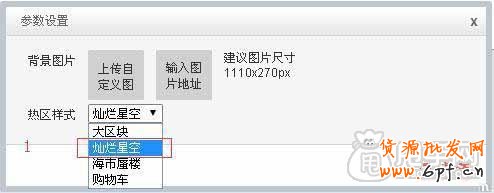 4. 在彈出的頁面熱區樣式下拉框中選擇燦爛星空,然后點擊上傳自定義圖,圖片大小為1110*270(這個圖就是紅圓點后面的背景圖,可根據自己的產品風格在網上找)