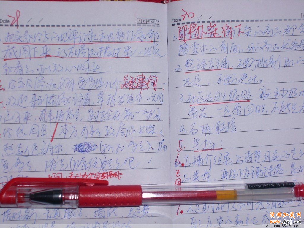 沒想到,畢業幾年,這個方法在偶開店做筆記的時候,又重出江湖了標題:  內容:  上傳日期:2008-05-17。我還是買了紅色的筆,標出每個編號下的內容關鍵詞。下面我給舉個例子,比如抄寫完“怎樣利用簽名檔推廣自己寶貝”的帖子后,用紅筆把“簽名檔”三個字下劃上一道紅線;再如“客流量最大時候保持在線”的帖子,在“客流量”三個字下標上紅線,然后把所說的時間用圈圈圈起來。這樣,大家明白了吧標題:  內容:  上傳日期:2008-05-17!