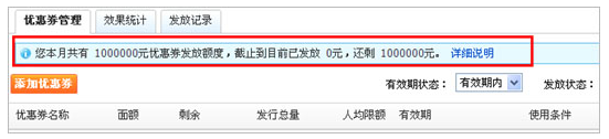 2)每月月初您可在“優惠券管理”頁面查看當月總發放額度(如下圖所示),已成功發放的優惠券才會扣減當月發放額度,若發放失敗,額度不扣減;