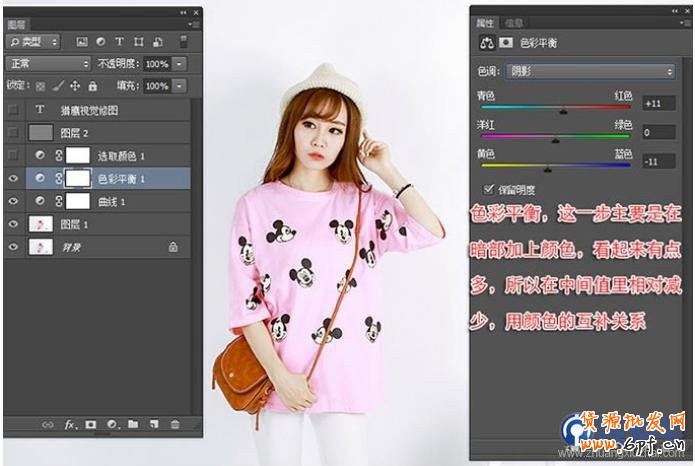 色彩平衡,這一步主要是在暗部加上顏色,看起來有點多,所以在中間值里相對減少,用顏色的互補關系。