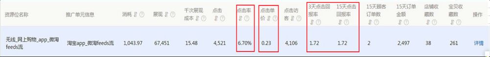 通過對訪客、DMP、場景定向進行測試,從數據可看出微淘資源位的點擊率、轉化效果都是絕對的。從圖中可以看出,商家測試的微淘資源位點擊率在6.7%左右,點擊單價更是低到0.23元,轉化率也接近2。