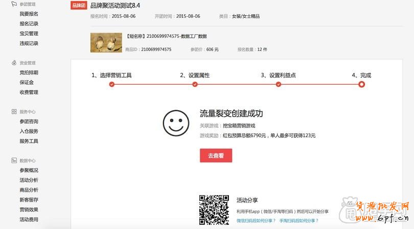 創建成功后,可以掃碼嘗試參與營銷活動,分享到各類微信群,或利用您的微信公眾號、微博、短信等各類無線渠道傳播該鏈接,同時聚劃算無線端在預熱期間也會露出活動入口。暫時僅支持預熱期間在聚劃算品牌團商品集合頁面(minisite頁面)露出入口,后續將支持更多入口。