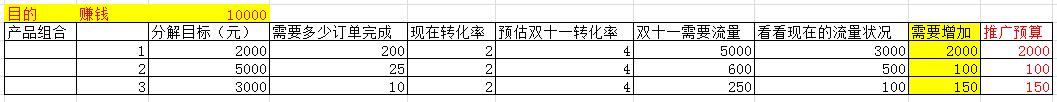 產品組合里的單品利潤是任何一位雙十一賣家心知肚明的,我們這一步要做的是根據產品組合,把雙十一活動的總利潤目標分解到每一款產品上去,從而確認雙十一活動的訂單預算目標,簡單的說就是要完成多少訂單才能達成目標。