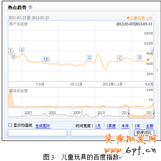 在打開的“百度指數分析”頁面中,輸入目標關鍵詞“兒童玩具”,完成后單擊右側的“查詢”按鈕。你可以發現這里出現了很多相關的關鍵詞,“指數”顯示的數字就是百度指