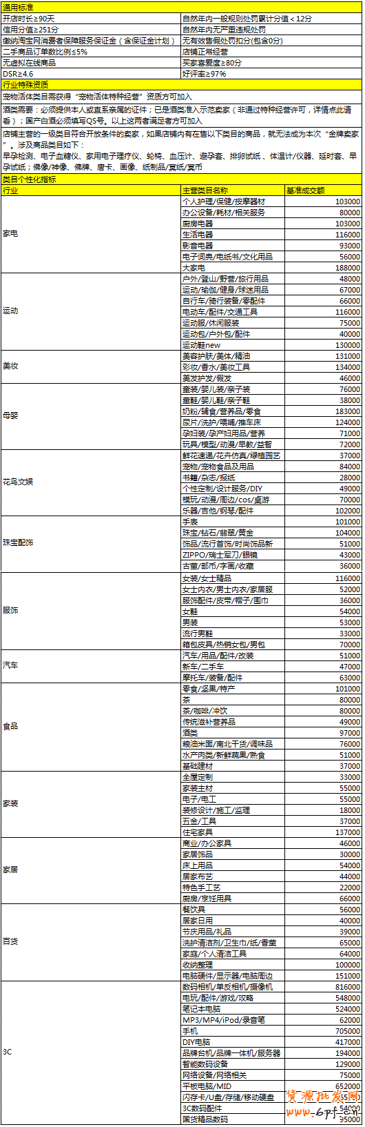 c.店鋪主營的一級類目符合開放條件的賣家,如果店鋪內有在售以下類目的商品,就無法成為本次淘寶金牌賣家。涉及商品類目如下: