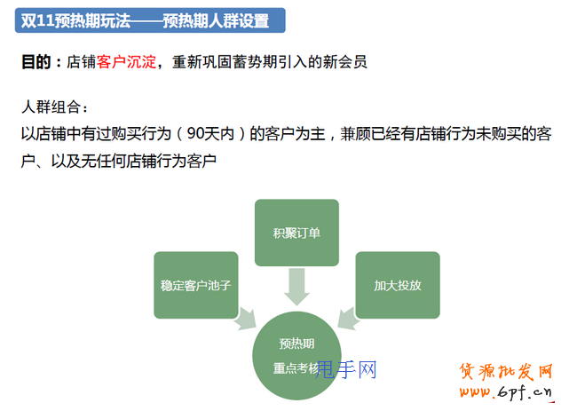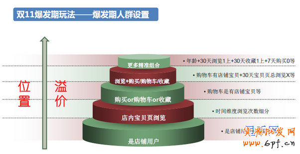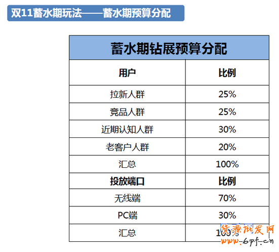 接著來看看整個蓄水期中預算方面的布局。隨著時間越來越接近雙11,預算也應該相應的遞增。針對不同人群,預算也應該有相應的分配,圖中是根據以往的安排和測試的數據得出大致的安排,供大家參考。