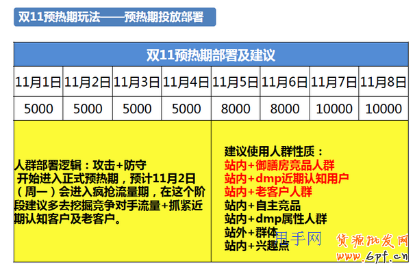 預熱期:到了預熱期,推廣消耗隨即拉升。在這里部署人群的核心是,既要攻擊,也要防守;既要把競爭對手的客群拉過來,轉化為自己的人群,同時也要防止自己的客群被對手拉走。同樣,預熱期也要根據人群去做預算分配,除了表格上的預算分類之外,賣家也可以根據10月的測試情況去做微調。