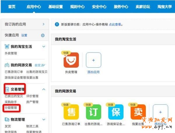 2)賣家需要打開新版賣家中心,如下圖顯示,點擊應用中心,選擇交易管理,選擇分期管理應用。