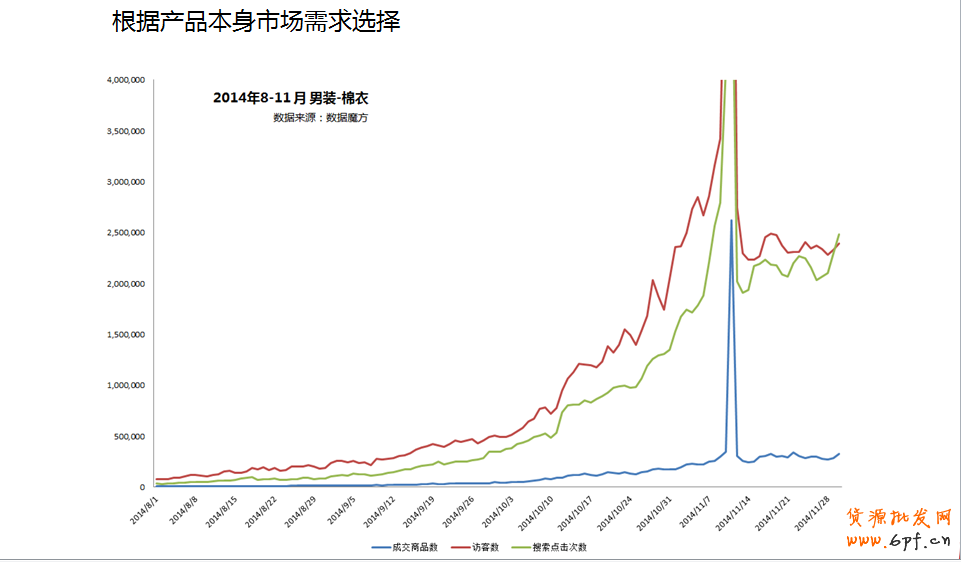 這里使用的工具是數據魔方,數據以2014年8月-11月男裝棉衣二級類目下整體數據為例,不過為了讓生意參謀作為商家統一的數據平臺,數據魔方將會在12月月底下線。它現在調整到了生意參謀的市場行情的專業版。