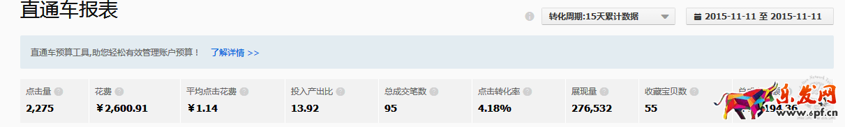經過合理的分析與規劃,借力雙11大勢,開展適合店鋪的運營策略,明確客戶需求,進一步挖掘寶貝精準目標人群,為店鋪帶來了突破性的成交。男裝PPC雖高,但只要合理規劃與培養,終可以突破自身門檻,找到適合自身的最佳平衡點。在雙11當天,賬戶流量達到高峰,roi高達13.92.店鋪銷售額較平時翻了100倍,最終實現100w目標。
