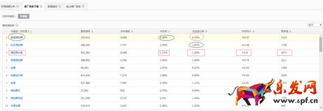 重點注意一下,這是我們做直通車每天都必須看的內容,這里圈出幾個要素,一個是站內站外的對比,還有一個就是pc和手機端的對比。通過圖上PC端和無線端不同的點擊率大家就可以類似的去選擇最有效的端口投放自己的產品以避免不必要的浪費。