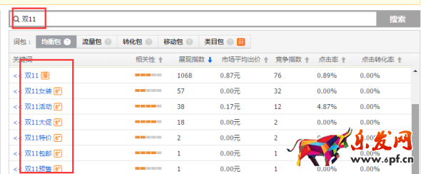 系統將從不同的維度推薦的關鍵詞分為5個詞包,為均衡包、流量包、轉化包、移動包、類目包。