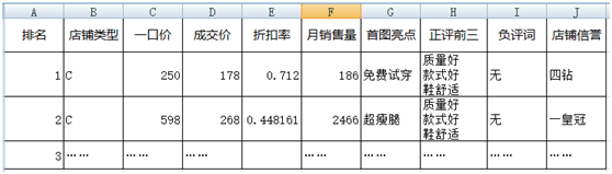 一般需要提取的數據包括:一口價、成交價、月銷量、首圖亮點、正評前三關鍵詞、負評關鍵詞、店鋪信譽等,可以參考下圖的樣子: