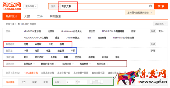 比如,一個用戶搜索“真皮女靴”,雖然這個用戶并沒有去用一些修飾詞,但是實際上,她的需求很固定。比如,在靴筒的高度上,靴跟的高度上,鞋跟的款式上、價格上等等。并且在搜索結果頁,既然淘寶搜索引擎把這些屬性列出來,說明是經過數據測算的,是用戶經常會選取的。所以你就可以通過點擊一些特定的屬性詞,以及卡一下價格,來把你真正的競爭對手選取出來。