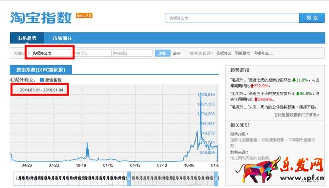 首先打開淘寶指數,搜索毛呢外套女,這里截取的時間比較長。從這個走勢圖我們可以看出毛呢外套女可以賣多久,這個時間還是比較長的。