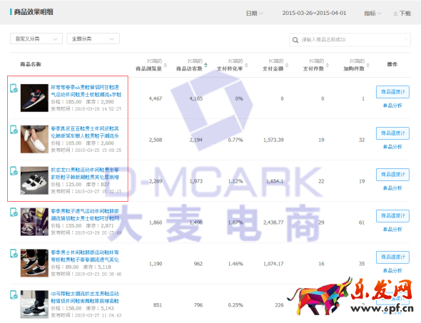從PC端的單品轉化率來看,根據訪客數排序,主要是圖中三款寶貝的轉化率影響較大。特別是第一款,流量占比最高,但是卻沒有轉化。